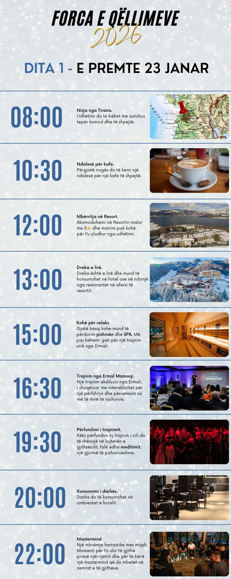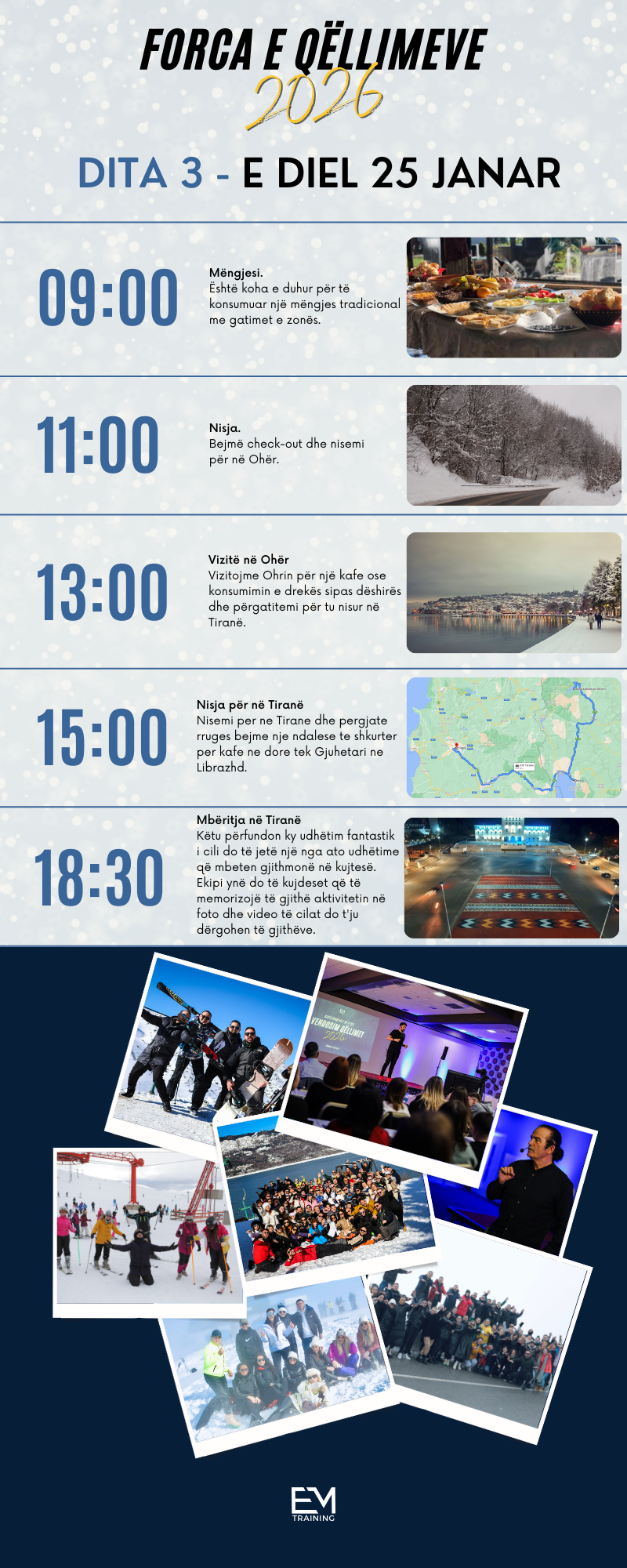 Tre ditët që do kalojmë bashkë, si dhe trajnimi nga Ermali do jenë të shoqëruara me interaktivitet & biseda për një përfshirje dhe përvetesim sa më të mirë të njohurive.